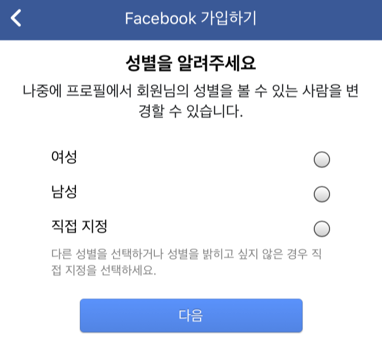PC버전과 똑같이 전화번호 또는 이메일로 가입이 가능하다. 자기가 원하는 걸로 가입하면 된다. 그리고 성별을 선택해준다. 성별을 밝히고 싶지 않은 경우에는 직접 지정을 선택하면 된다.